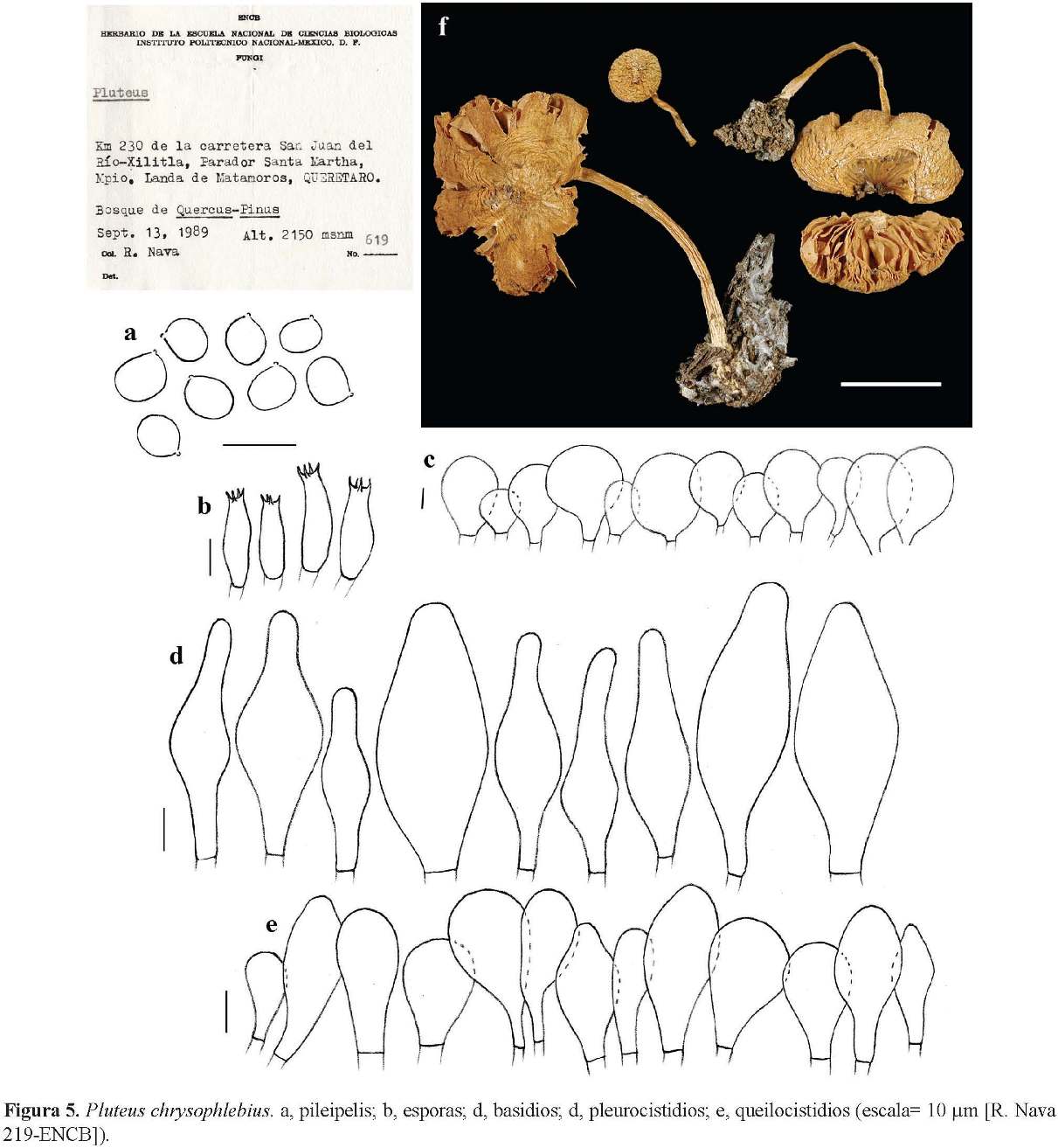 La especie es caracterizada por presentar basidiomas amarillos y el píleo fuertemente venoso (Berkeley y Curtis, 1859). Los materiales mexicanos concuerdan con lo descrito por Singer (1956, 1958) y Pegler (1983), y de acuerdo a la diagnosis original de la especie. Se hizo la revisión del holotipo de Pluteus chrysophlebius (Ravenel s.n.) y otros materiales (Fiard 974-A, K), así como de ejemplares de P. admirabilis (Homola-1409, MICH), encontrándose afinidad con los ejemplares mexicanos.