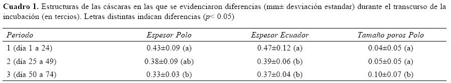Durante el periodo de incubación. El espesor de la cáscara en el polo y en el ecuador fue diferente entre los tercios de incubación (Kruskal-Wallis, polo: H 2,51 = 10.47, p = 0.005; ecuador: H 2,51 = 11.46, p = 0.003; Cuadro 1). Durante el transcurso de la incubación se redujo el espesor en ambas regiones (Correlación de Spearman, r ρ = -0.49, p = 0.001). El porcentaje de adelgazamiento del espesor de la cáscara fue del 20%. Además, se encontró que el tamaño de los poros en los polos fue diferente entre tercios (Kruskal-Wallis, H 2,51= 6.92, p = 0.027; Cuadro 1), ya que éstos incrementaron su tamaño durante la incubación (Correlación de Spearman, r ρ = 0.39; p = 0.004). Siendo clara la diferencia entre el primero y el último tercio de incubación (Cuadro 1). Sin embargo, no se observaron cambios durante la embriogénesis, en la densidad de poros en el polo como en el ecuador, y en el tamaño de los poros en el ecuador (H 2,51> 23.2, p > 0.10). En cuanto a la ultraestructura, se observaron 2 fragmentos con microscopio electrónico de barrido. Las unidades de cáscara están constituidas por cristales tabulares de calcita que crecen de manera radial, formando cuñas de contorno irregular.