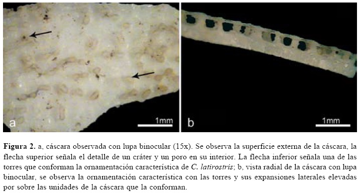 Características micro-estructurales y macro-estructurales de las cáscaras. La capa calcárea de la cáscara de C. latirostris está formada por delgadas láminas constituidas por cristales de calcita (Fig. 1). En la superficie externa de esta capa, los huevos presentan una ornamentación conspicua, integrada por columnas; dichas columnas están constituidas por los mismos depósitos concéntricos de calcita que forman las unidades de la cáscara. Las torres se forman cuando se interrumpe en ciertos intervalos la deposición continua de las capas que forman la cáscara (Fernández et al., 2013). Las láminas concéntricas que conforman cada torre se expanden a diferentes alturas y se conectan irregularmente con otra columna adyacente conformando la ornamentación (Figs. 1, 2). Entre las columnas se encuentran cráteres de forma cónica, cuya base se orienta hacia el exterior, y en el interior de estos cráteres aparecen los poros, los que atraviesan las capas del huevo.