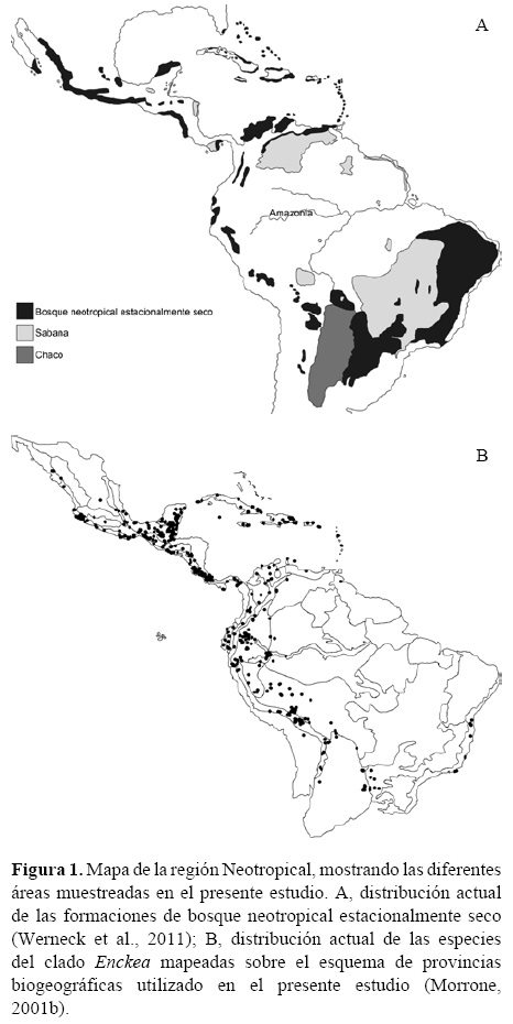 En el presente trabajo se realizó un análisis de trazos enfocado en las áreas de bosque neotropical estacionalmente seco (BNES), los cuales debido a su tipo de cobertura y grado de afinidad florística con otros biomas han sido históricamente difíciles de clasificar, delimitar, e incluso de conservar si son comparados con los bosques húmedos. El escaso conocimiento sobre la dinámica y origen de estos biomas ha incentivado la realización de diferentes estudios relacionados con la historia tectónica de las áreas geográficas donde ocurren y la biología de las especies que allí habitan (Pennington et al., 2000, 2004, 2009; Padilla y Halffter, 2007; Caetano et al., 2008). Este tipo de biomas se encuentran distribuidos en áreas disyuntas a lo largo de la región Neotropical, en zonas libres de heladas, donde la pluviosidad es inferior a 1 600 mm al año, con un periodo de 5 meses donde se reciben menos de 100 mm de lluvias. Durante la estación seca más del 50% de la cobertura arbórea se puede perder y el grado de deshoje aumenta con la disminución de las lluvias (Fig. 1A). Estos bosques están esencialmente compuestos por árboles que forman un dosel continuo o casi continuo, el cual se fragmenta cuando las precipitaciones llegan a los 500 mm o menos (Murphy y Lugo, 1986; Bullock et al., 1995; Pennington et al., 2000, 2009).