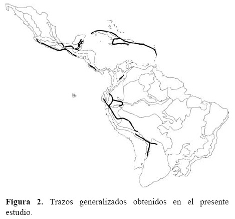 Seis de estos trazos generalizados fueron identificados en formaciones de BNES, en América Central, las Antillas y los valles interandinos. Asimismo, 2 trazos generalizados corresponden a zonas de bosque húmedo tropical ubicadas en América Central y del Sur (Fig. 2). El trazo T1 está sustentado por 6 especies y se ubica en el dominio Antillano (Morrone, 2004), que incluye formaciones de BNES en las provincias de Puerto Rico, Cuba, La Española, Jamaica y las Antillas Menores. Trabajos previos han descrito la afinidad biogeográfica de estas provincias con base en datos de distribución de escarabajos y vertebrados (Rauchenberger, 1988; Crother y Guyer, 1996).