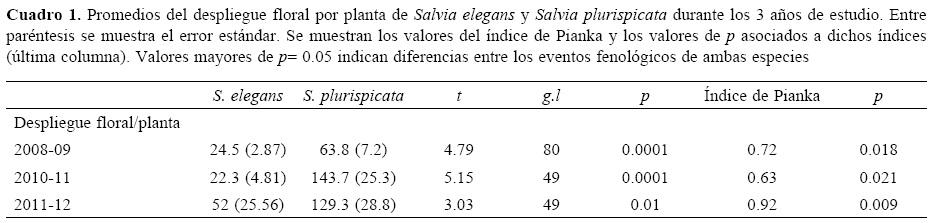 Respecto a la primera pregunta que nos planteamos al inicio de este trabajo, los resultados muestran que existe un traslape total en la floración de S. elegans y S. plurispicata durante los 3 años de estudio. En relación con el despliegue floral, S. plurispicata produjo consistentemente un mayor número de flores durante los 3 periodos de floración evaluados. Sin embargo, se observaron variaciones importantes entre años en el número promedio de flores por planta, principalmente, en S. plurispicata (Fig. 2).