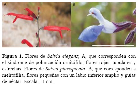 En el caso de las especies cercanamente relacionadas, se han propuesto varios factores que pueden contribuir a la coexistencia de dichas especies. Por ejemplo, separando la producción de flores en el tiempo (Mayr, 1942; Rocha et al., 2004) o atrayendo a distintos grupos de polinizadores (Schemske y Bradshaw, 1999). Una forma de simplificar la relación entre las flores y sus polinizadores ha sido la propuesta de los síndromes de polinización, según la cual, ciertas características florales (i. e., tamaño, color y forma) y tipos de recompensas (i. e., cantidad y concentración de néctar) permiten inferir quién o quiénes pueden ser los polinizadores (Faegri y Van Der Pijl, 1966). Este concepto ha sido criticado, principalmente, debido a que las flores suelen atraer mayor diversidad de visitantes florales de la que se espera, con base en su síndrome (Waser et al., 1996; Ollerton, 1998; Gómez y Zamora, 2006; Ollerton et al., 2009). Una propuesta que ha relajado el concepto "clásico" de los síndromes de polinización es la de Fenster et al. (2004), quienes plantearon que las plantas pueden adaptarse a lo que llamaron grupos funcionales de polinizadores (i. e. moscas de lengua larga) de acuerdo con la semejanza en las presiones selectivas que ejercen. El género Salvia (Lamiaceae) (Ramamoorthy y Elliot, 1998) es considerado un ejemplo de polinización especialista (Grant, 1994; Armbruster et al., 2009) y de las 602 especies registradas en el nuevo mundo, 58% se han clasificado como melitófilas y el 31% como ornitófilas (Wester y Claßen-Bockhoff, 2011). El 11% restante de las especies no muestra una morfología floral que pueda ser claramente relacionada con alguno de esos 2 grupos o algún otro. Además, es común observar poblaciones de 2 o más especies de Salvia coexistiendo en el mismo sitio (Dieringer et al., 1991), lo que representa un escenario ideal para explorar el grado de traslape floral entre especies simpátricas, la fidelidad de los polinizadores y su papel en el aislamiento reproductivo, así como el mantenimiento de la diversidad morfológica floral en grupos emparentados. Aquí, nosotros estudiamos a Salvia plurispicata Epling, una especie con caracteres florales que corresponden con el síndrome de polinización por abejas, y a Salvia elegans Vahl, cuyas flores concuerdan con el síndrome de polinización por aves (Fig. 1), y nos planteamos las siguientes preguntas: 1, ¿en qué grado se traslapa la floración de S. elegans y S. plurispicata?; 2, ¿en qué grado predice el síndrome floral de cada especie a los visitantes florales?; 3, ¿las visitas florales que no corresponden con su síndrome de polinización, son equivalentes en ambas especies?; es decir, ¿la especie melitofílica recibe el mismo porcentaje de visitas de colibríes que la especie ornitofílica visitas de abejas?