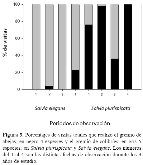 Visitantes florales. En los 3 años de estudio se registraron 5 especies de colibríes (Selasphorus platycercus, Hylocharis leucotis, Archilocus colubris, Atthis heloisa y Lampornis clemenciae) y 4 especies de abejas (Deltoptila sp., Apis mellifera, Tetraloniella sp. y Bombus ephippiatus). Salvia elegans fue visitada durante los 3 años por 3 especies de colibríes (Selasphorus platycercus, Hylocharis leucotis y L. clemenciae) que contribuyeron con 93% de las visitas y por 3 especies de abejas (A. mellifera, Tetraloniella sp. y B. ephippiatus) que representaron 6.7% de las visitas (Fig. 3). En S. plurispicata se observó un patrón inverso en la contribución de las visitas por abejas (77.5%) y colibríes (22.5%) en los 3 años de estudio (Fig. 3). De acuerdo con la propuesta de Fenster et al. (2004), las especies de abejas pueden agruparse en un gremio de polinizadores, abejas de lengua larga, y los colibríes en otro gremio. La contribución relativa de los 2 gremios de visitantes varió entre las temporadas reproductivas registradas para las 2 especies de Salvia. En el caso de S. elegans, los ámbitos mínimo y máximo de la contribución de vistas por abejas fue de 0 a 23%, mientras que los de los colibríes fue de 77 a 100%. En S. plurispicata se observó una mayor variación de las visitas por tipo de visitante. La contribución de las abejas fluctúo entre el 36 y 100%, mientras que la contribución de las visitas registradas de colibríes varió de 0 a 64%.