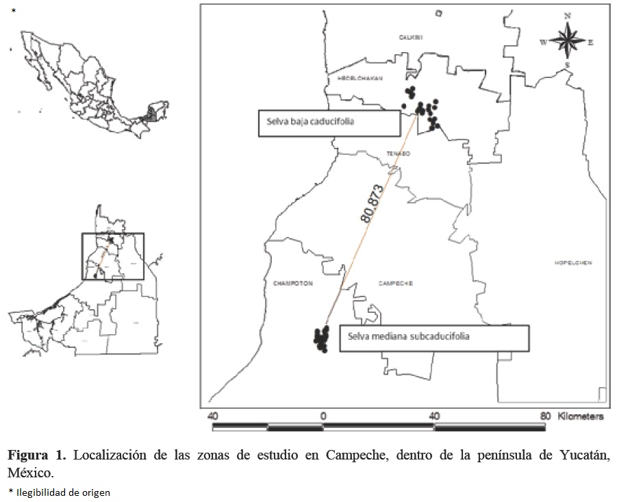 Área de estudio. El estudio se realizó en una comunidad de selva baja caducifolia y otra en selva mediana subcaducifolia, ubicadas en los ejidos de Pomuch y San José Carpizo 1, respectivamente, separados entre sí 80 km y localizados en el norte-centro del estado de Campeche, México (Fig. 1). El ejido de San José Carpizo 1, localizado en la planicie de Campeche, se ubica sobre material sedimentario con rocas calizas dolomitizadas, silicificadas y detríticas. La SMS se presenta en suelos de tipo leptosol, en laderas y lomas, rodeadas de tierras agrícolas con suelos tipos gleysol y rendzina (Cuanalo-De la Cerda et al., 1989). La altitud varía entre 35 y 250 m, con temperatura media anual de 26° C y una precipitación media anual de 1 250 mm (Orellana-Lanza et al., 1999). El ejido de Pomuch se ubica en la planicie litoral de Yucatán, conformada por rocas sedimentarias calizas y materiales detríticos. Las altitudes varían de 0 a 50 m. La selva se distribuye en las lomas y laderas que presentan suelos de tipo leptosol, rodeadas de valles agrícolas donde dominan los suelos de texturas medias a someras, de los tipos regosol, rendzinas, gleysol, luvisol y vertisol (Cuanalo-De la Cerda et al., 1989). La temperatura media anual es 25° C y la precipitación media anual alcanza 1 200 mm (Orellana-Lanza et al., 1999).