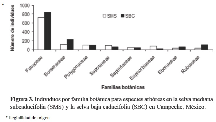 Análisis comparativo entre las 2 selvas. Los datos obtenidos en las selvas estudiadas en Campeche, coinciden con los de Zamora-Crescencio (2003); Zamora-Crescencio et al. (2011); Gutiérrez-Báez et al. (2011) y Dupuy et al. (2012) para estudios en la península de Yucatán y con los obtenidos en Oaxaca por Gallardo-Cruz et al. (2005). En todos ellos, se manifiesta la predominancia de la familia Fabaceae dentro de las comunidades de ambos ecosistemas selváticos. La dominancia de especies de la familia Fabaceae influye en los valores de uniformidad, relativamente bajos, que se registran en las selvas estudiadas en Campeche. Por otro lado, el patrón de abundancias refleja la frecuente aparición de pocas especies muy abundantes y un gran número de especies poco abundantes o raras (Gutiérrez-Báez et al. 2011).