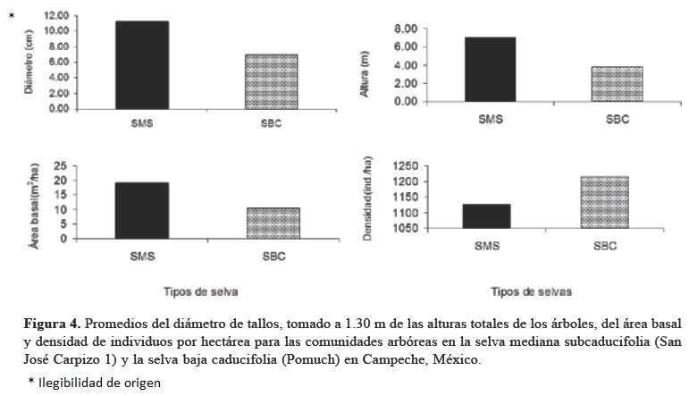Riqueza, diversidad y estructura de la selva mediana subcaducifolia. La riqueza de especies registrada en la SMS está dentro del ámbito documentado en diferentes localidades de la península de Yucatán (Zamora-Crescencio, 2003, 2008; Gutiérrez-Báez et al., 2011, 2012a, 2012b), mientras su composición, dominada por especies pertenecientes de la familia Fabaceae, coinciden con la de otros estudios realizados en la península de Yucatán (Flores, 1987; Barber et al., 1999; Zamora-Crescencio et al., 2008, 2011).