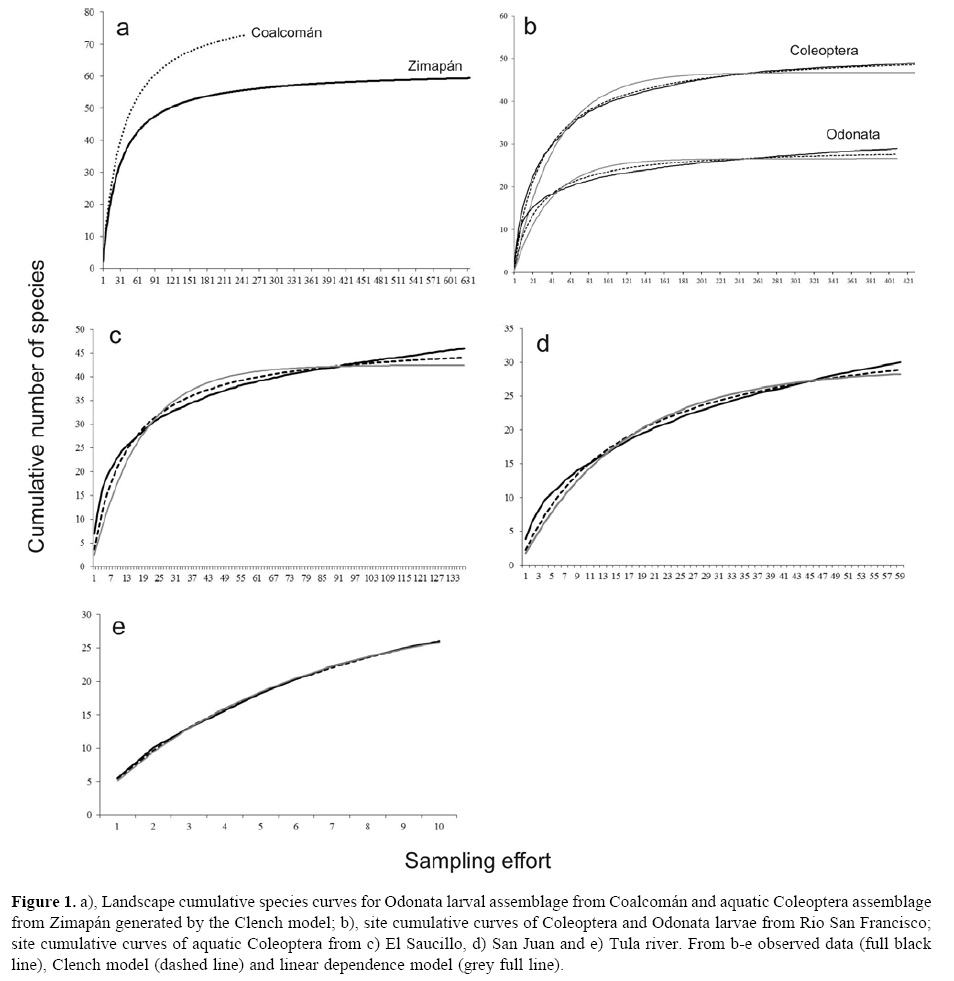 Data analysis. Curves of aquatic Coleoptera and Odonata larval species accumulation were generated versus sampling effort for each of the 9 streams (local) separately, and for ZHP and CMR (landscape). To assess inventory completeness relative to sampling effort, and to construct species accumulation curves, we fitted 2 asymptotic models (Soberón and Llorente, 1993) to our data using EstimateS 8.0 software (Colwell, 2009; Longino and Colwell, 1997), a Linear Dependence Model (LDM) and the Clench Model (CM). LDM assumes that as the species list increases the probability of adding new species diminishes exponentially and is a model that is ideal for the study of small areas and known taxa (León-Cortés 1994, León-Cortés et al. 1998). Equation of LDM is: