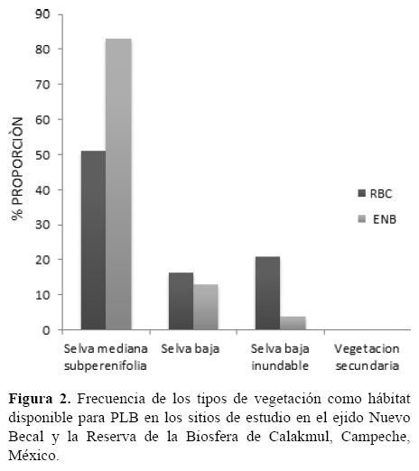 Hábitat disponible. En ambos sitios de estudio, la selva mediana subcaducifolia fue el tipo de vegetación dominante, representando 83% en el ENB y 52% en la RBC (Fig. 2). La selva baja fue representada de manera similar en los 2 sitios: 17% en la RBC y 13% en el ENB , pero la selva baja inundable fue 3 veces menos frecuente en el ejido (4%) que en la RBC (21%).