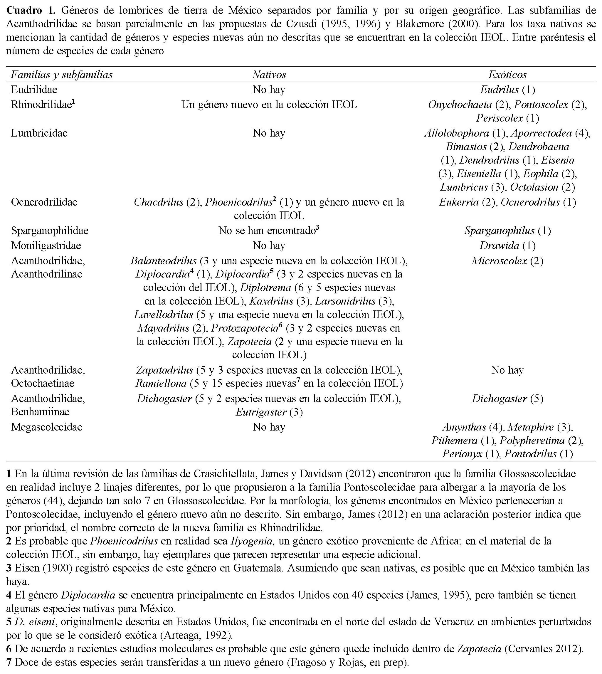 La última estimación de la riqueza de lombrices de tierra de México (Fragoso, 2007) indicaba 98 especies descritas, de las cuales 47 eran nativas y 51 exóticas. Desde entonces se han descrito 4 especies más (Fragoso y Rojas, 2007, 2009a), por lo que actualmente, México cuenta con igual número de lombrices de tierra nativas y exóticas (51 spp.) y un total de 102 especies. Sin embargo, en la colección IEOL del INECOL, mantenida por los autores desde hace más de 20 años, hay cerca de 40 especies que han sido provisionalmente determinadas como nuevas y que se espera describir en los próximos años (Cuadro 1).