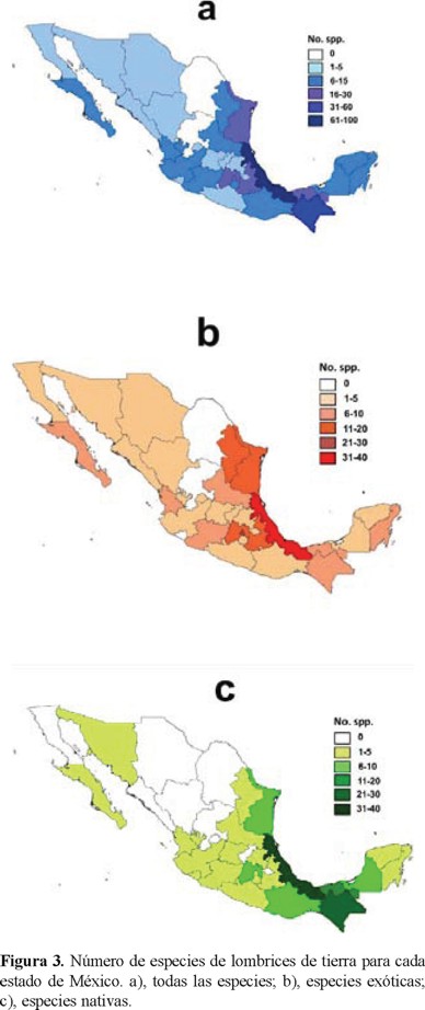 Como ya se ha registrado (Fragoso, 2001, 2007), Veracruz es el estado con mayor cantidad de especies, seguido de Chiapas, Tamaulipas y Tabasco. Si bien esto refleja un mayor muestreo, también es una indicación de que las lombrices se encuentran preferentemente en los estados con mayor cantidad de ambientes cálido-húmedos. En contraste, en los estados ubicados en zonas áridas, la cantidad de especies es muy baja (v.g. Aguascalientes y Chihuahua con una sola especie exótica) o inexistente (ninguna especie en Coahuila y Zacatecas), aunque estos datos seguramente están influidos por la falta de recolectas. Un muestreo adecuado en los ambientes húmedos de estas regiones áridas (generalmente inducidos por el hombre) revelará la presencia de algunas especies de lombrices de tierra, aunque es muy probable que éstas sean exóticas.