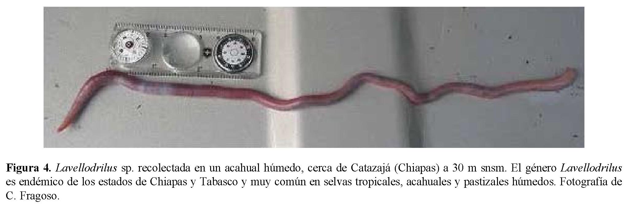 Patrones por región biogeográfica. Las zonas mejor estudiadas de México se encuentran en el este y sureste, y corresponden a las partes más húmedas del país; por esta razón la evaluación biogeográfica que podamos hacer necesariamente estará sesgada a estas regiones. Fragoso et al. (1995) propusieron algunos patrones biogeográficos que se han mantenido en estudios posteriores (Fragoso, 2007) y que sucintamente se pueden resumir del siguiente modo: i) región norte: caracterizada por la presencia de los géneros Zapatadrilus, Diplocardia, Zapotecia y Protozapotecia (Fig. 1), incluye la sierra Madre Oriental, el centro y este de la Faja Volcánica Transmexicana FVT y el norte de la planicie costera del golfo de México; ii) región oriental: dominada por una sección de especies del género Ramiellona, incluye el este de la FVT, las montañas de Oaxaca y el sur de la planicie costera del golfo hasta el istmo de Tehuantepec; iii) región sur: definida por otra sección de especies de Ramiellona y por los géneros Lavellodrilus, Kaxdrilus y Mayadrilus (Fig. 4), abarca desde el sur del istmo de Tehuantepec hasta El Salvador y Honduras y iv) Región montañosa centro-oeste: caracterizada por los géneros Dichogaster y Eutrigaster (Figs. 1, 2), incluye la sierra Madre Occidental, la sierra Madre del Sur, los sistemas montañosos de Chiapas y la porción centro-occidental de la FVT. Estos patrones se proponen de manera preliminar pues aún faltan por estudiar extensas zonas del país.