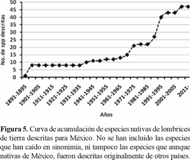 Patrones de estudio de las lombrices nativas: pasado y presente. En la figura 5 se muestra el número de especies de lombrices de tierra oriundas de México acumuladas durante los últimos 120 años. Entre 1891 y1900, el sueco nacionalizado estadounidense G. Eisen describió las primeras 8 especies. Para el año de 1970, sólo se habían descrito otras 7 especies para México (para un total de 15 especies), principalmente por los trabajos de G. Gates, E. Pickford y G. Righi. A partir de esa fecha se han descrito 32 especies más (68% de todas las especies descritas hasta el momento), siendo el periodo 1991-1995 en donde la mayor cantidad de especies se describieron (13) debido a los estudios de S. James, C. Fragoso y P. Rojas. Las referencias de las descripciones originales de las especies nativas de México descritas hasta el año 2001 pueden consultarse en Fragoso (2001).