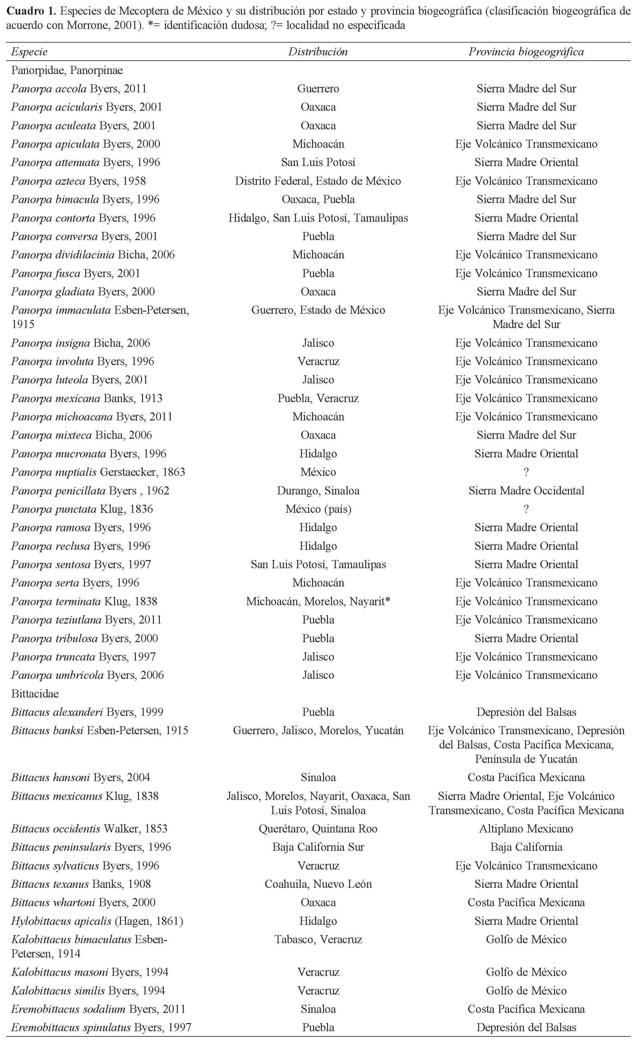 La familia Panorpidae es principalmente circumboreal, presente en Europa, Asia y Norteamérica. Las especies de Panorpa conocidas del suroeste y centro sur de México se encuentran en lugares húmedos, en áreas montañosas arriba de los 1 200 m (Bicha, 2006). Así, el patrón de distribución de Panorpa parece apegarse a las principales cadenas montañosas del país, como el Eje Volcánico Transversal, la sierra Madre Oriental, la sierra Madre Occidental y la sierra Madre del Sur (Cuadro 1), con una marcada afinidad neártica. La familia Bittacidae, en contraste, tiene una distribución principalmente meridional (gondwánica), con numerosas especies en África, Sudamérica y Australia, pero relativamente pocas en los continentes del norte; sin embargo, en los últimos años se han reportado varias especies e incluso un par de géneros endémicos del sur de China. En México los bittácidos se encuentran invariablemente en ambientes cálidos, debajo de los 1 500 m (Cuadro 1). De acuerdo con Byers (1996), la fauna mexicana de Mecoptera es esencialmente endémica y en la mayoría de los casos, cada especie sólo se conoce de 1 o 2 localidades. De 47 especies registradas en México, 42 se distribuyen sólo en el interior del país, lo cual indica un 91% de endemismo.