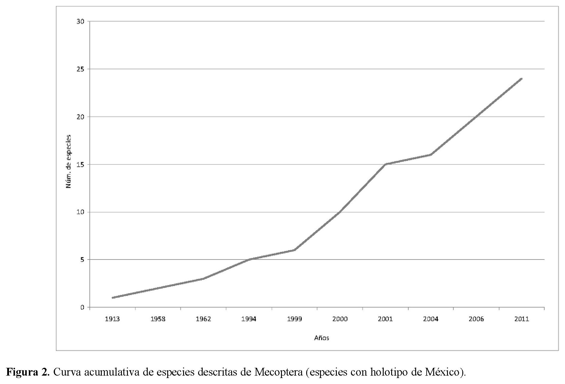 Durante 120 años de exploración entomológica en México (1838-1958), sólo 9 especies de Mecoptera fueron descritas (Fig. 2). El primer mecóptero mexicano descrito fue Bittacus mexicanus Klug, 1838. Después de 75 años, se describió Panorpa mexicana Banks, 1913; 40 años después, fue descrita Panorpa azteca Byers, 1958. El trabajo de campo en las últimas décadas ha resultado en un incremento en el conocimiento de la fauna mexicana, principalmente con los trabajos de Byers (1994, 1996, 1999, 2000, 2001, 2011) y Bicha (2006). No existen trabajos de biogeografía de mecópteros mexicanos, salvo descripciones generales (Byers, 1996; Bicha, 2006). La página web "World checklist of extant Mecoptera species" (Penny, 2011) es una excelente guía para profundizar en el estudio de la fauna mexicana.