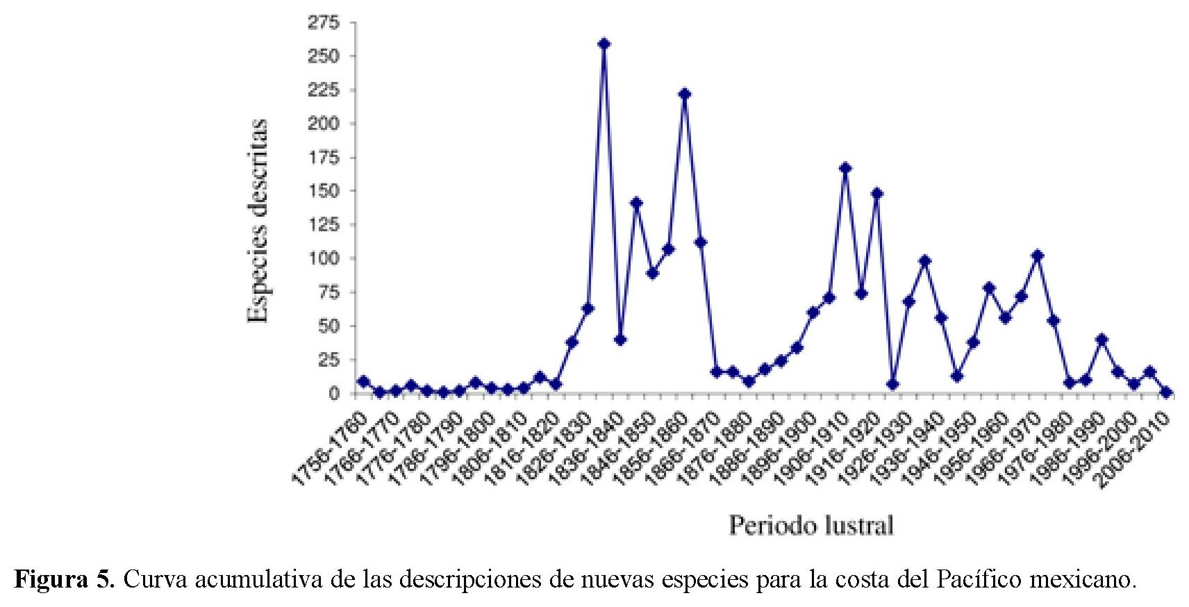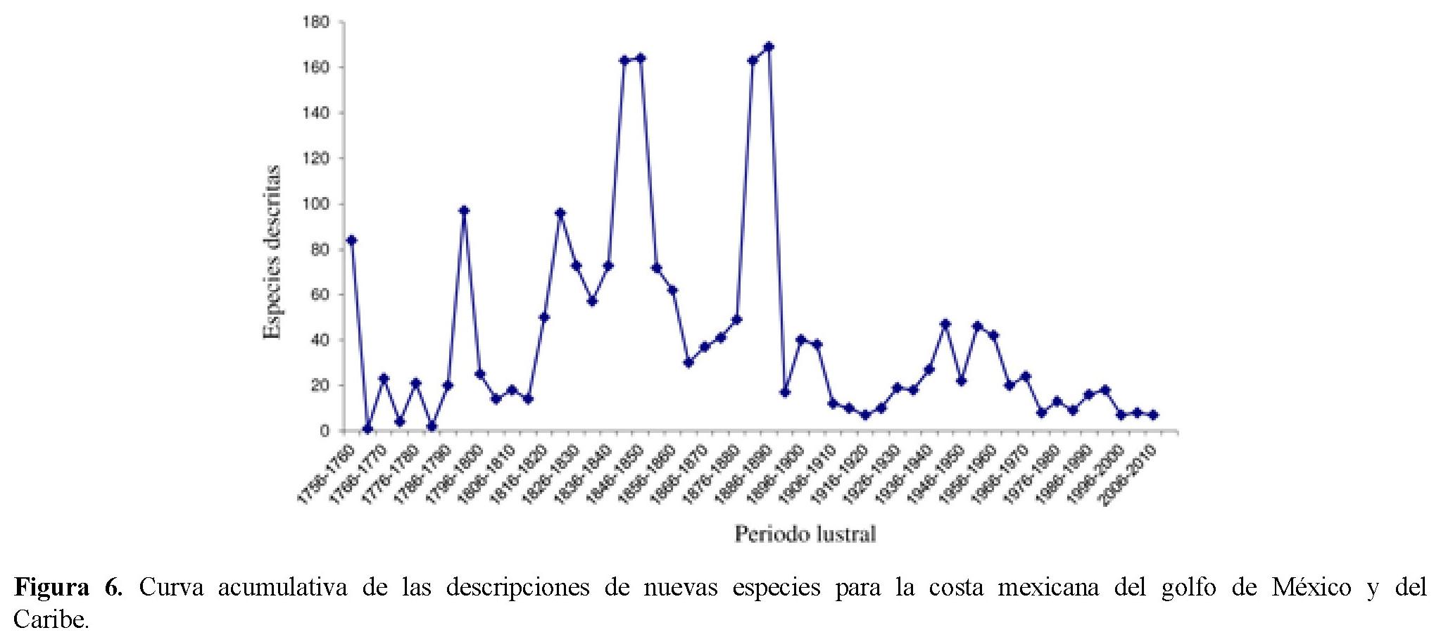 Síntesis histórica del descubrimiento de especies. La cronología de las descripciones de las especies a lo largo de 250 años nos muestra 2 tendencias de máximos de aportaciones a la biodiversidad malacológica, aquí cabe destacar la labor en tiempos pasados de autores extranjeros. Para la costa del Pacífico mexicano las tendencias de máximas aportaciones son de 1831-1835, 1856-1860, 1906-1910, 1916-1920 y 1966-1970 (Fig. 5). Cerca del 90% de especies han sido reconocidas desde 1970. Para el golfo de México y Caribe las grandes aportaciones fueron en 1841-1850 y 1881-1890 (Fig. 6). A principios del siglo XIX, en nuestras costas ya se habían examinado el 80% de las especies ahora reconocidas. Las tendencias después de estos máximos han ido a la baja. Quizás exista un repunte con nuevas especies descritas en especies de opistobranquios, holoplanctónicas, micromoluscos y de mar profundo.