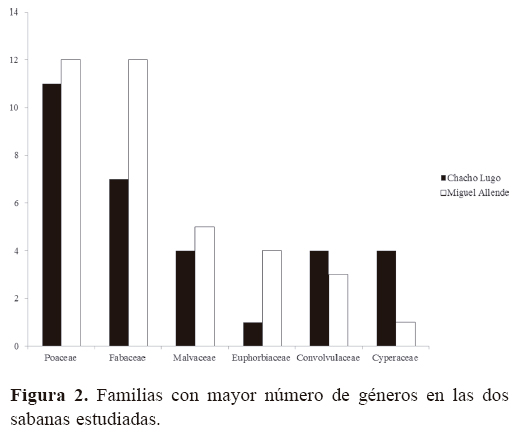 En las 2 sabanas estudiadas las familias botánicas más diversas fueron Poaceae y Fabaceae, lo que es consistente con lo registrado para otras sabanas neotropicales por otros autores (Rippstein et al., 2001; Pérez-García et al., 2001; Huber et al., 2006; López-Olmedo et al., 2006). Las Cyperaceae y Asteraceae han sido mencionadas entre las familias con mayor número de especies en las sabanas de Belice (Goodwin et al., 2013) y aunque presentes en los sitios estudiados, fueron relativamente menos ricas. Es importante hacer notar que la sabana Chacho Lugo por sus condiciones topográficas particulares de anegamiento temporal favoreció una mayor presencia de especies de Cyperaceae. Las sabanas también incluyen algunos grupos que son exclusivos de estas comunidades vegetales como lo son: Rhynchospora, Scleria, Utricularia, Eleocharis, Chamaecrista, Fimbristylis y Polygala y que son característicos en otras regiones de México, Centro y Sudamérica (Puig, 1972; Pérez-García et al., 2001; Bridgewater et al., 2002; López-Olmedo et al., 2006; Parra, 2006).