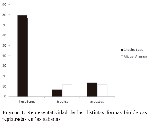 Para las 2 sabanas estudiadas se registraron en total 142 especies, 96 géneros y 36 familias de angiospermas (Apéndice); 138 especies se identificaron a nivel de especie y 7 sólo a nivel de género, debido a la presencia de estructuras reproductoras inmaduras y la ausencia de bibliografía especializada pertinente para su correcta identificación. En Chacho Lugo se registraron 88 especies y en Miguel Allende 78. Solamente 24 de las 142 especies son comunes a ambos sitios. La familia mejor representada a nivel genérico fue Poaceae (18), seguida de Fabaceae (16), Malvaceae (6), Euphorbiaceae (5), Cyperaceae (4) y Convulvulaceae (3), aportando en conjunto 51.04% del total de los géneros encontrados en las 2 áreas de estudio (Fig. 2). Asimismo, la familia Poaceae es la que mayor número de especies presenta (34), seguida por Fabaceae (19), Cyperaceae (9), Convolvulaceae (10) y Malvaceae (8) (Fig. 3), representando 56.34% del total de las especies encontradas en las sabanas estudiadas. Los géneros con mayor número de especies registradas fueron Paspalum (6), Chamaecrista (4), Evolvolus (4), Solanum (4), Cyperus (3) y Rhynchospora (3). El análisis de la composición florística de ambas sabanas muestra diferencias notables a nivel de familia, compartiéndose solamente 54.1% de las mismas. Las familias Asteraceae (Calea jamaicensis, Pectis elongata, Vernonia ctenophora, Wedelia trilobata), Bignoniaceae (Crescentia cujete), Eriocaulaceae (Eriocaulon bilobatum), Gentianaceae (Schultesia guianensis), Iridaceae (Cipura campanulata), Lentibulariaceae (Utricularia subulata), Loganiaceae (Spigelia polystachya), Olacaceae (Schoepfia schreberi), Onagraceae (Jussiaea decurrens) Primulaceae (Bonellia albiflora) y Santalaceae (Phoradendron wattii) sólo están presentes en la sabana Chacho Lugo. Por otra parte, las familias Apocynaceae (Asclepias woodsoniana y Asclepias sp.), Bixaceae (Cochlospermum vitifolium), Orobanchaceae (Buchnera pusilla) y Polygonaceae (Coccoloba barbadensis) se registraron únicamente en la sabana Miguel Allende. Solamente 33.33% de los géneros y 16.90% de las especies son compartidas por ambos sitios de estudio. Los géneros comunes a ambas sabanas se ubican dentro de las familias más diversas como, por ejemplo, Convolvulaceae (Evolvolus, Ipomoea, Merremia), Cyperaceae (Rhynchospora), Euphorbiaceae (Euphorbia), Fabaceae (Bauhinia, Chamaecrista, Mimosa), Malvaceae (Melochia, Waltheria) y Poaceae (Aristida, Hyparrhenia, Imperata, Panicum, Paspalum, Schizachyrium, Setaria, Urochloa). Entre las especies que se comparten pueden citarse a Curculigo scorzonerifolia (Hypoxidaceae), Schwenckia americana (Solanaceae), Piriqueta cistoides (Passifloraceae), Lantana camara (Verbenaceae) e Hybanthus oppositifolius (Violaceae), entre otras. El valor Ij obtenido fue de 0.169 (Cuadro 1). Las plantas herbáceas fueron las más abundantes en ambos sitios estudiados, representando 79.58% del total de las especies registradas, seguidas por los arbustos (12.68%) y los árboles (7.45%). Al realizar el análisis comparativo de las sabanas, se observa que el porcentaje de especies que representan las herbáceas en Chacho Lugo y Miguel Allende fue de 85.23 y 76.92%, respectivamente; en el caso de los árboles 6.81 y 10.25%, y para los arbustos 11.36 y 11.53%, respectivamente (Fig. 4).