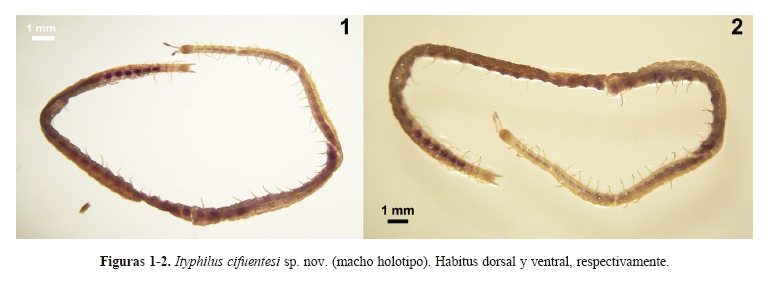 Diagnosis. Longitud del cuerpo de 31 y con 65 pares de patas (macho) (Figs. 1 y 2). Antenas geniculadas y distalmente clavadas, con una curva en la parte media, 3 veces más largas que la placa cefálica y no están juntas en su base. Borde interno liso de los tarsungula forcipulares. Coxoesterno forcipular sin líneas de quitina evidentes. Superficie de los terguitos rugosa. Campo de poros de los esternitos 2-61 de forma transversalmente ovoide. Forma trapezoidal del esternito del último segmento que posee patas caminadoras y la razón entre el borde anterior y el borde posterior es de 1.5: 1.