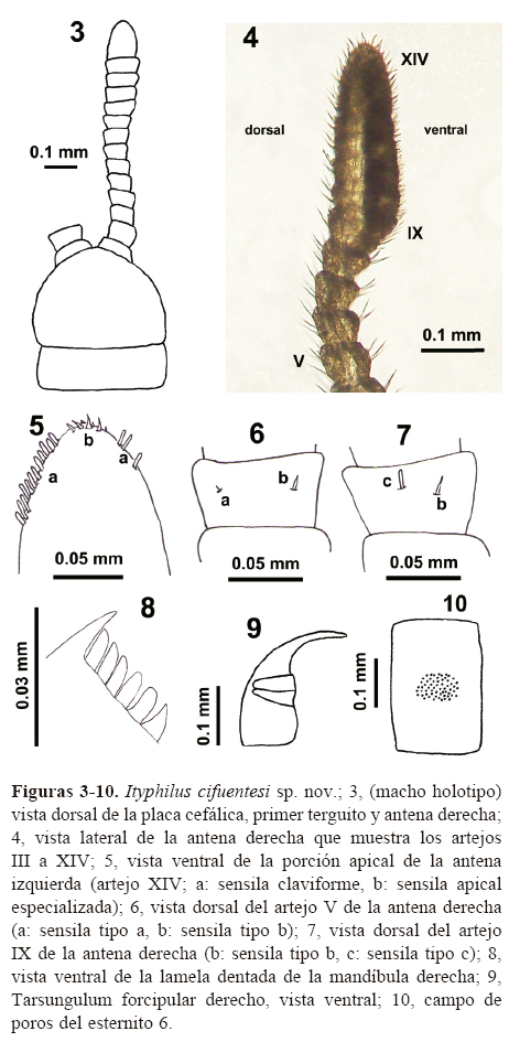 Descripción. Holotipo macho (CNAC-MyT00022). Habitus como en las figuras 1 y 2. Sesenta y cinco pares de patas. Longitud total del cuerpo de 31. El cuerpo se adelgaza en su parte anterior y posterior, más grueso en la parte media. Ancho de algunos segmentos del cuerpo seleccionados arbitrariamente: 1 (0.35); 6 (0.38); 18 (0.60); 27 (0.62); 40 (1.04); 50 (0.75); 62 (0.42). Bajo el microscopio, la coloración de los terguitos, pleuritas y patas del ejemplar preservado en alcohol es de un tono amarillo pálido; los esternitos presentan un color amarillo pálido con la parte media de un tono púrpura, algunas zonas con un tono más intenso que otras. A simple vista, esta combinación de colores le confiere un tono gris claro. Antena geniculada y distalmente clavada, con una curva en la parte media, 3 veces más larga que la placa cefálica (Fig. 3). Los artejos basales de ambas antenas no están en contacto (Fig. 3). La razón entre el ancho del artejo distal más ancho de la antena (artejo X) entre el ancho del artejo proximal (artejo VI) más angosto es de 1.5: 1. Artejo XIV más largo que ancho (razón 1.5: 1). La razón entre el largo del artejo XIV y el XIII es de 2: 1. La razón entre el largo del artejo XIV y el largo sumado de los artejos XI a XIII es de 0.5: 1. En la parte ventral de las antenas, las cerdas de los artejos I a VIII son más largas y en menor número que las presentes en los artejos IX a XIV, las cuales son cortas y más numerosas (Fig. 4). Dorsalmente, las cerdas de los artejos antenales I a VIII son similares a las que se presentan en el lado ventral, pero las cerdas de los artejos IX a XIV son mucho más largas y menos numerosas que las del lado dorsal (Fig. 4). En la parte apical del artejo antenal XIV se observan sensilas en forma de clava; en el borde externo se tienen 12 sensilas y 3 en el borde interno; además, en la parte distal del artejo XIV se presentan 6 sensilas hialinas especializadas muy pequeñas (Fig. 5). La superficie ventral y dorsal de los artejos antenales II, V, IX y XIV con sensilas especializadas muy pequeñas, denominadas a, b y c (Pereira y Minelli, 1996, para más detalle sobre este tipo de sensila). Ventralmente, las sensilas están localizadas en la parte apical y media del artejo y están distribuidas como sigue: una sensila tipo a presente en el artejo IX y una sensila tipo b en cada uno de los artejos II, V y IX; en el artejo XIII no se observaron sensilas de ningún tipo. Dorsalmente, las sensilas también se ubican en posición apical y media y están distribuidas como sigue: una tipo a en al artejo V, una tipo b en los artejos II, V y IX; así como una tipo c en el artejo IX y 2 tipo c en el artejo XIII (Figs. 6, 7). La placa cefálica es más ancha que larga (razón ancho/largo, 1.5: 1). Ancho de la placa cefálica de 0.42 y los márgenes laterales convergen ligeramente en la parte anterior. El número de setas posantenales es de 2+2. Lamelas dentadas de la mandíbula derecha con 6 dientes (Fig. 8) y la izquierda con 5 dientes. Lamelas pectinadas de las mandíbulas con 11 dientes hialinos a la derecha y con 9 dientes hialinos a la izquierda. En la segunda maxila la uña apical es bipectinada. Ancho del coxoesterno forcipular de 0.34. El borde interno de los tarsungula forcipulares es liso (Fig. 9). Las forcípulas, completamente cerradas, no se extienden más allá del margen anterior de la placa cefálica. En el coxoesterno forcipular las líneas de quitina no son evidentes. La superficie de los terguitos es rugosa, pero no presenta sulci evidentes y se encuentra cubierta con cerdas moderadamente largas. El campo de poros de los esternitos es de forma transversalmente ovoide (Fig. 10), se presentan desde el segmento 2 al 61. Las uñas de las patas 1 a la penúltima con 3 espinas accesorias en posición ventrobasal, una anterior y 2 posteriores. Forma trapezoidal del esternito del último segmento que posee patas caminadoras y con razón entre el borde anterior y el borde posterior de 1.5: 1. Hembra desconocida.