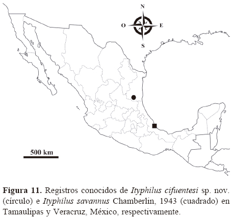 Existen rasgos morfológicos en I. cifuentesi sp. nov. que permiten separarla de I. savannus, la otra especie del género registrada en México y con distribución Neotropical (Boca del Río, Veracruz, a 486 km al sureste de la cueva El Pachón, Tamaulipas; Fig. 11); ya que en esta última el macho mide 16 mm, tiene 55 pares de patas y el campo de poros subcircular se presenta desde el esternito 2 al 51 (Chamberlin, 1943a). Desafortunadamente, la descripción proporcionada por Chamberlin (1943a) sobre I. savannus es escasa e imprecisa, por lo que se desconocen caracteres diagnósticos importantes como si los tarsungula forcipulares son lisos o aserrados. Otra especie del Ityphilus cercana al área de distribución de I. cifuentesi sp. nov. es I. nemoides Chamberlin, 1943 del condado texano de Jim Wells, Estados Unidos, distante a 594 km al noreste de la cueva El Pachón, Tamaulipas. Las características que permiten distinguir a esta especie (macho) de I. cifuentesi sp. nov. son: el campo de poros circular y 73 pares de patas (Chamberlin, 1943b). Para esta especie, Chamberlin (1943b) no describe si la parte interna de los tarsungula forcipulares es lisa o aserrada.