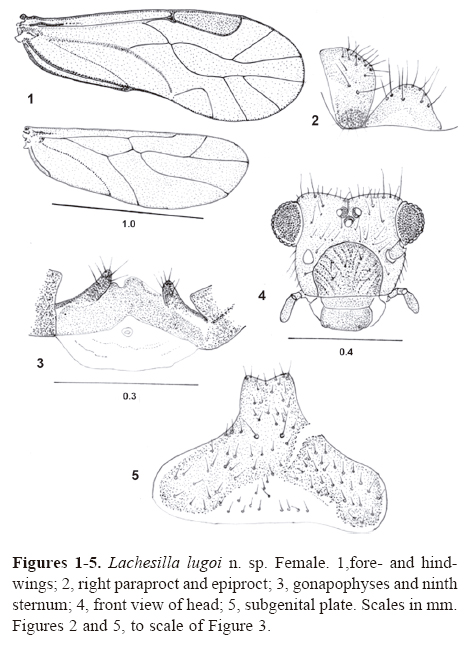 Remarks. L. lugoi sp. n., belongs in a complex of South American species in which the female subgenital plate, gonapophyses and ninth sternum are built on the same plan. An undescribed species, from the state of Chiapas, in southern Mexico, also belongs in that complex. The described species included are L. brasiliensis García-Aldrete and L. carioca García-Aldrete, from Brazil, L. iguazuensis García-Aldrete, from Argentina, and L. veneper García-Aldrete, from Venezuela and Peru. The females in this complex differ in the shape of the projection of the subgenital plate, in the pigmented area of the subgenital plate, and in the shape of the gonapophyses and pigmentation of the ninth sternum. In the males of L.iguazuensis and L. veneper the epiproct has two projections, short in the former and very long in the latter, so it may be predicted that in L. lugoi sp. n., L. brasiliensis and L. carioca, as well as in the undescribed Mexican species, the male epiprocts have similar projections.
