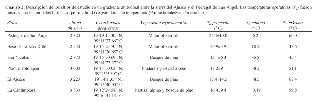 Se seleccionaron 6 sitios de estudio separados por ~200 m de altitud en un gradiente desde los 2 320 hasta 3 530 m snm (Fig. 1). Las características físicas y geográficas de cada uno se muestran en el Cuadro 2, así como sus altitudes correspondientes. Todos los sitios se ubicaron en la ladera noreste de la sierra del Ajusco ya que ésta es más húmeda, debido a factores ambientales como exposición a la radiación solar (Auslander et al., 2003), mayores precipitaciones provocadas por el efecto de sombra orográfica del volcán y a los vientos predominantes del noreste (Rzedowski, 2006; García-Aguirre et al., 2007). En todos los sitios hay rocas basálticas y derrames volcánicos que sirven como refugio a la herpetofauna local. La vegetación está constituida de diferentes comunidades vegetales con respecto a la exposición, pendiente y altitud. El zacatonal alpino se presenta entre los 3 300 y 3 900 m. y dominan las gramíneas Festuca amplissima y Muhlenbergia macroura. Los bosques de coníferas se presentan sobre los 2 400 m de altitud, al igual que los bosques mixtos de Pinus spp. y Quercus spp. (Velázquez et al., 2010). La composición de especies dominantes en la zona de bosque varía según la ladera, pero presenta especies propias del zacatonal que dominan los estratos bajos de la vegetación. Las principales especies son Calamagrostis tolucensis, M. macroura, Pinus hartwegi, Abies religiosa, Pinus montezumae, Solanum cermtessi, Senecio angulifolius y Senecio barba-johannis, siendo las 2 últimas indicadoras de perturbación (García-Aguirre et al., 2007). Bajo los 2 500 m, las comunidades cambian para dar paso al matorral xerófilo. Este sistema de matorral, propio del Pedregal de San Ángel, se encuentra dominado por especies herbáceas, principalmente anuales, pocos arbustos y en menor medida elementos arbóreos, que no superan los 4 m de altura (Castillo-Argüero et al., 2009; Velázquez et al., 2010). Entre las especies más representativas se encuentran Buddleia cordata, Echeveria gibbiflora, Bromus carinatus, Verbesina virgata, Muhlenbergia robusta y varias especies de herbáceas exóticas y nativas, aunque la composición florística del Pedregal de San Ángel es altamente variable dadas las condiciones topográficas propias de la formación (Rzedowski, 2006; Castillo-Argüero et al., 2009).