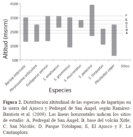 Especies consideradas en el estudio. En este trabajo se incluyen a las siguientes 9 especies presentes en la región: Barisia imbricata, Phrynosoma orbiculare, Sceloporus aeneus, S. anahuacus, S. grammicus, S. mucronatus, S. palaciosi, S. torquatus y Plestiodon copei (Uribe-Peña et al., 1999; Méndez-De la Cruz et al., 2009; Ramírez-Bautista et al., 2009). Todas son diurnas, insectívoras y con patrones de distribución bien definidos (Fig. 2). En general, se clasifican por la manera que captan el calor ambiental como: a) heliotermos, mediante la radiación solar directa (convección) y b) tigmotermos, por contacto con el sustrato (conducción). En el Cuadro 1 se muestran las estrategias de termorregulación, los periodos reproductores (cortejo, apareamiento, gestación/preñez, incubación, parto/eclosión) y la distribución altitudinal.