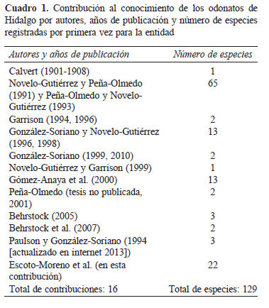 En 1996, González-Soriano y Novelo-Gutiérrez recopilaron los registros de libélulas por estados de la República Mexicana y anotaron 76 especies para Hidalgo, considerándolo en ese momento como un estado regularmente conocido, el cual ocupaba el décimo lugar en número de especies. Después de 1996 y hasta el presente, se han documentado 93 especies, ocupando el décimo primer lugar (González-Soriano y Novelo-Gutiérrez, 2014). Sin embargo, al realizar la revisión histórica de los registros de las especies considerando las publicaciones recientes, se integran 11 especies más que no fueron incorporadas en la lista anterior del estado (104 especies), incluidas en 15 contribuciones (Cuadro 1; Apéndice 2).