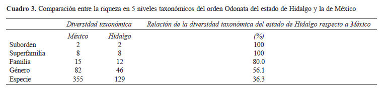 Hidalgo es el quinto lugar en diversidad de libélulas por km2, ya que ocupa el lugar 26 en extensión territorial y los estados con más registros de odonatos que Hidalgo lo superan considerablemente en extensión territorial, y sólo estados pequeños con un alto conocimiento de los odonatos como Aguascalientes, Colima, Distrito Federal y Morelos, lo superan. Por ahora, tiene el sexto lugar en riqueza de especies de odonatos a nivel nacional, sólo superado por Veracruz (222), Chiapas (185), San Luis Potosí (138), Oaxaca (137) y Michoacán (135). El total de especies de Hidalgo corresponde a más de 1/3 de las especies conocidas para el país, a nivel de género es más de la mitad, y de familia más de 3/4 partes de las registradas para México (Cuadro 3).