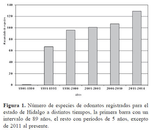 La fauna de odonatos de Hidalgo era prácticamente desconocida hasta 1991, excepto por una especie registrada por Calvert (1901-1908). Esto implica que el conocimiento sobre este grupo de insectos en el estado es reciente, ya que fue en los últimos 23 años cuando se incrementó notablemente el número de especies (Fig. 1). Aunado a lo anterior, no fue sino hasta finales de los años ochenta que se inició el estudio de las libélulas en la entidad por especialistas mexicanos (Novelo-Gutiérrez y Peña-Olmedo, 1991; Peña-Olmedo y Novelo-Gutiérrez, 1993; Peña-Olmedo, 2001).