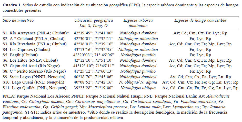 Sitios de estudio. La recopilación de datos sobre las variables ambientales asociadas a la fructificación de las diferentes especies, se llevó a cabo en 11 rodales de Nothofagus sp., ubicados en un gradiente geográfico desde los 43°20'08" S y 71°45'06" O a los 39°25'28" S y 71°19'00" O, en territorios de las provincias de Chubut, Río Negro y Neuquén en Argentina (Cuadro 1). En todos los casos, se escogieron bosques libres de invasión por coníferas exóticas y sin intervención por ganado. Para la descripción fenológica, la medición de la frecuencia de hallazgo, abundancia y la estimación de la productividad relativa se trabajó en el rodal S1, ubicado en el Parque Nacional Los Alerces, provincia de Chubut (Cuadro 1), que presentaba una alta diversidad de HSC.