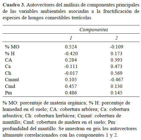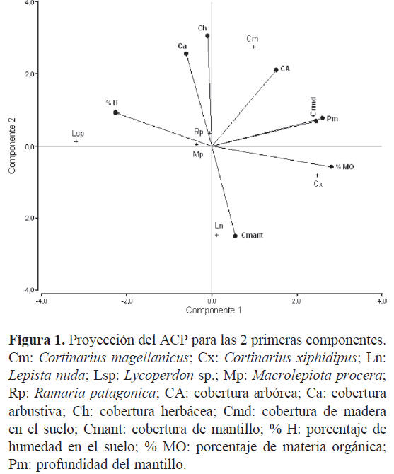 Variables ambientales asociadas a la fructificación de los hongos comestibles terrícolas. El ACP permitió asociar la fructificación de algunas especies con variables ambientales asociadas a los 2 primeros componentes, que explicaron el 79.80% de la variabilidad total (Cuadro 2). Cortinarius xiphidipus y Lycoperdon sp. se ubicaron en los extremos del primer componente, asociado positivamente con las variables de contenido de materia orgánica, profundidad de mantillo y cobertura de madera en el suelo, y negativamente con el contenido de humedad (Cuadro 3; Fig. 1). Cortinarius magellanicus y L. nuda se ubicaron en los extremos del segundo componente, asociado positivamente con cobertura arbórea, cobertura arbustiva y cobertura herbácea, y negativamente con cobertura de mantillo (Cuadro 3; Fig. 1). En tanto M. procera y R. patagonica no presentaron correlación con ninguna de las variables consideradas (Fig. 1). Las variables edáficas % arcilla, % limo, % arena no fueron incluidas en el ACP, debido a que todas las muestras de suelo correspondieron a la misma clase textural franco arenosa (Irisarri et al., 2007), por lo que no actuarían como condicionantes de la fructificación para las especies bajo estudio.