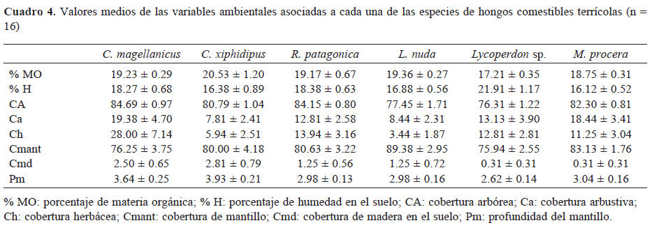 El estudio de las variables ambientales permitió establecer asociaciones estrechas entre dichas variables y la presencia de las especies de hongos comestibles tanto terrícolas como lignícolas. La profundidad del mantillo resultó ser una variable asociada, principalmente a la fructificación de las especies micorrícicas C. magellanicus y C. xiphidipus, que presentaron los mayores valores (Cuadro 4), lo cual coincide con lo documentado por Bergemann y Largent (2000) para la especie micorrícica Cantharellus formosus Corner, con valores que no superaban los 5 cm. La calidad y la cantidad de mantillo en el suelo es un factor importante para la formación de micorrizas en el bosque, aunque muchos grupos de hongos micorrícicos no fructifican donde hay grandes cantidades debido a una inadecuada aireación del suelo (Bergemann y Largent, 2000). Sin embargo, en el caso de C. xiphidipus, todas las especies de esta sección (estirpe Xiphidipus; Moser y Horak, 1975) se caracterizan por un estípite largo, radicante, lo cual probablemente constituya una adaptación a la presencia de capas de hojarasca o de cenizas volcánicas profundas, frecuentes en los bosques andino-patagónicos. Por otra parte, la especie saprófita Lycoperdon sp. se correlacionó negativamente con esta variable, fructificando en sitios con una profundidad de mantillo baja, en contraposición con lo planteado por Vogt et al. (1992), que afirman que las especies saprófitas se desarrollan sobre grandes cantidades de desechos orgánicos.