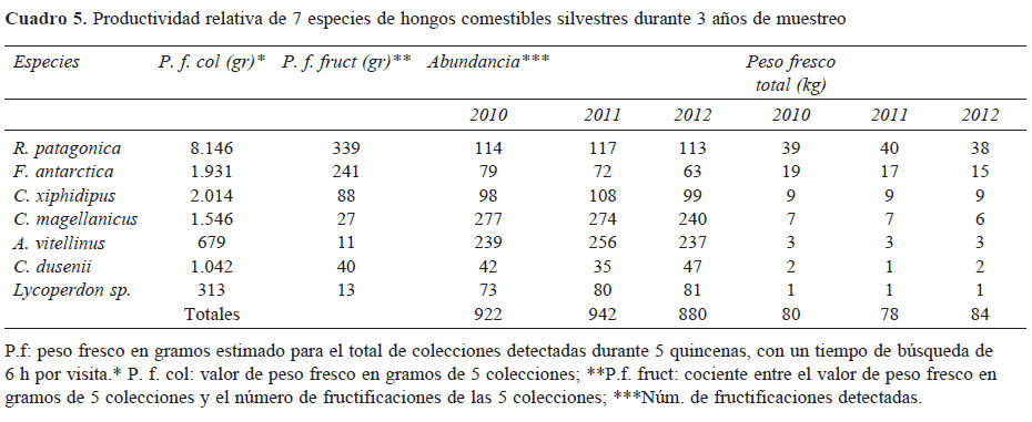 Frecuencia de hallazgo y abundancia. A lo largo de las quincenas la especie más frecuente en el inicio de la temporada fue F. antarctica, seguida por C. magellanicus y A. vitellinus. A finales de marzo las especies más frecuentes fueron F. antarctica, C. magellanicus, R. patagonica y A. vitellinus. Las especies micorrícicas C. magellanicus y R. patagonica fueron las más frecuentes a mediados de abril, en tanto que C. xiphidipus fructificó con mayor frecuencia entre finales de abril y mediados de mayo (Fig. 3). Al considerar la frecuencia de fructificación por temporada, las especies con frecuencia alta fueron F. antarctica, C.magellanicus y R. patagonica, detectándose entre 30 y 40 veces. En tanto las especies de frecuencias intermedias durante las 3 temporadas fueron A. vitellinus, C. xiphidipus y Lycoperdon sp. detectadas entre 16 y 27 veces. Por último, entre las especies raras o de baja frecuencia figuró C. dusenii en los 3 años, observada entre 4 y 7 veces. Sin embargo, los datos sobre frecuencia de hallazgo por temporada no siguieron el mismo patrón de abundancia para las especies en estudio. En orden decreciente las especies más abundantes fueron C. magellanicus, A. vitellinus, R. patagonica, C. xiphidipus, Lycoperdon sp., F. antarctica y C. dusenii en las 3 temporadas (Cuadro 5).