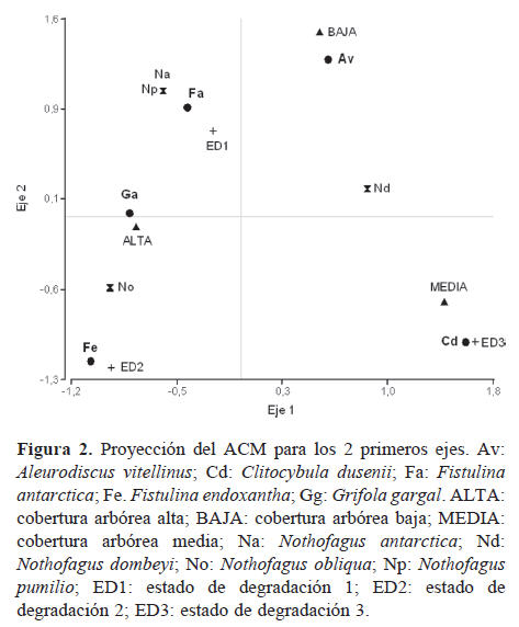 Variables ambientales asociadas a la fructificación de los hongos comestibles lignícolas. El ACM, con una inercia total acumulada del 53.09%, permitió establecer diferentes asociaciones entre las variables ambientales y la presencia de las especies lignícolas. El primer eje, con una inercia del 30.64%, mostró una clara asociación entre las variables cobertura alta y la especie arbórea Nothofagus obliqua (Mirb.) Oerst. con G. gargal (Fig. 2). El segundo eje con una inercia del 22.45%, asoció a la especie F. antarctica con las especies arbóreas N. pumilio (Poepp. y Endl.) Krasser y N. antarctica (G. Forst.) Oerst. y estado de degradación 1, y a A. vitellinus con una cobertura arbórea baja (Fig. 2). En tanto las especies C. dusenii y F. endoxantha, se asociaron a una cobertura media y un estado de degradación 3 en el primer caso, y a un estado de degradación 2 y a la especie arbórea N. obliqua en el segundo (Fig. 2).