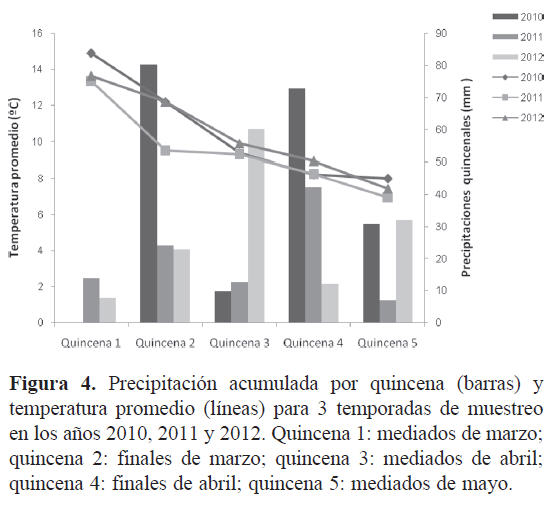 Los valores de temperatura registrados para las 5 quincenas fueron variables durante las 3 temporadas de muestreo, oscilando entre 8 y 15° C en 2010, entre 6 y 14° C en 2011 y entre 7 y 14° C en 2012 (Fig. 4).