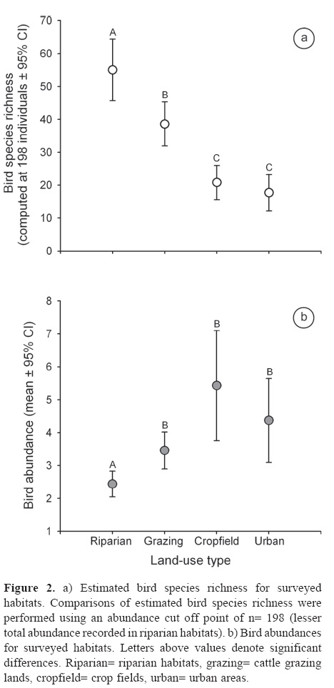 In general, anthropogenic habitats that constitute human dominated landscapes exhibit less diverse and more dominated bird communities than natural habitats (McKay, 1980). Nevertheless, bird community responses to distinct anthropogenic habitats (e.g., crop fields, cattle grazing lands, urban settlements) are not completely understood, as current studies have reported contradictory results. For example, crop fields do not always exhibit more diverse and complex bird communities than cattle grazing lands as suggested by Morris (2000), as this pattern could vary in relation to the remaining vegetation structure and the location of cattle grazing lands across the landscape (Estrada et al., 1997; MacGregor-Fors and Schondube, 2011). Moreover, urbanization is not consistently more negative for birds than agricultural lands (McKay, 1980; Bellocq et al., 2008), as certain cultivation practices could be more detrimental for bird communities than urban development itself (Petit et al., 1999; Faggi et al., 2008). Finally, although riparian habitats have been highlighted as crucial for wildlife species (Naiman et al., 1993; Woinarski et al., 2000; Sabo et al., 2005), little is known about their importance for bird communities within extremely human-altered landscapes.