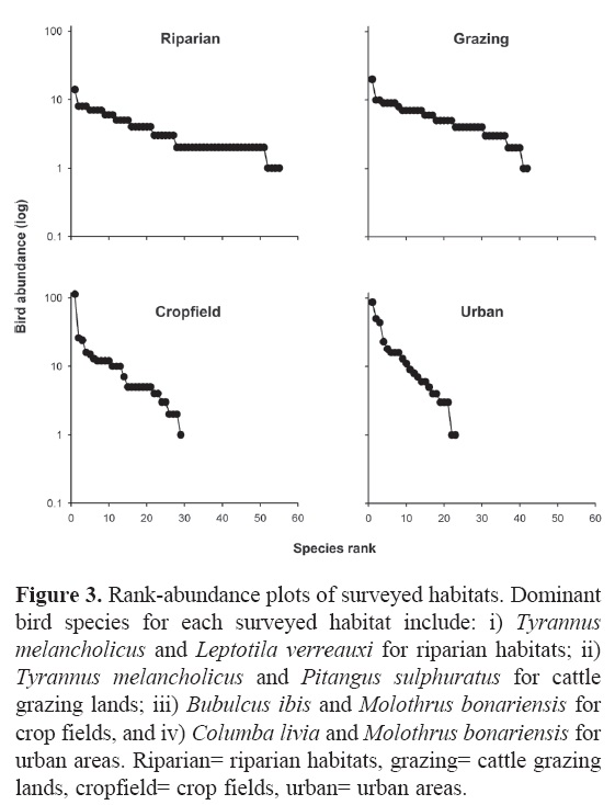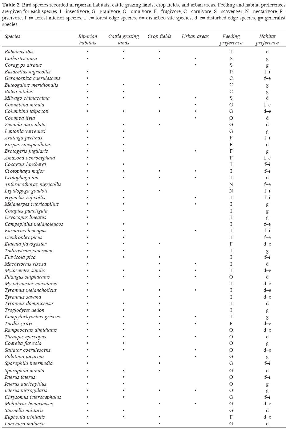We recorded a total of 57 bird species among surveyed habitats (Table 2). According to the IUCN Red List of Threatened Species, all recorded species are classified under the "least concern" category (IUCN, 2011). Riparian habitats contained the highest number of bird species (55 spp.), followed by cattle grazing lands (42 spp.), crop fields (29 spp.), and urban areas (23 spp.). Recorded bird species were classified into 8 different groups according to their feeding preferences, with insectivores comprising the majority of recorded species (37%), followed by granivores (19%), omnivores (16%), frugivores (12%), carnivores (5%), scavengers (5%), nectarivores (4%), and piscivores (2%). In relation to species' habitat preferences, 28% of the total number of recorded species were generalist species, 23% were disturbed site species, 19% were disturbed edge species, 19% were interior forest species, and 11% were edge forest species.