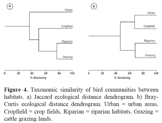 Similarity of bird communities. Jaccard ecological distance showed that cattle grazing lands and riparian habitats contained very similar bird communities in relation to their taxonomic compositions (77% similarity), followed by crop fields (50% similarity), and by urban areas (36% similarity) (Fig. 4a). Bray-Curtis ecological distance also suggested that cattle grazing lands and riparian habitats shared taxonomically similar bird communities (69% similarity) (Fig. 4b). However, under this approach, crop fields and urban areas comprised a separate cluster (68% similarity), which was very different to that associated with cattle grazing lands and riparian habitats (46% similarity).