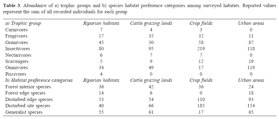 Riparian habitats and cattle grazing lands had the most functionally similar bird communities (83% similarity), followed by crop fields (68% similarity), and by urban areas (67% similarity). In particular, riparian habitats contained species from all trophic groups, with insectivores and granivores the most abundant (Table 3a). Cattle grazing lands were dominated by insectivore and omnivore species (Table 3a). With regard to crop fields, insectivores were widely dominant, followed by granivore species (Table 3a). Nectarivores, carnivores, and piscivores were absent from urban areas, while omnivores and insectivores dominated the community (Table 3a).
