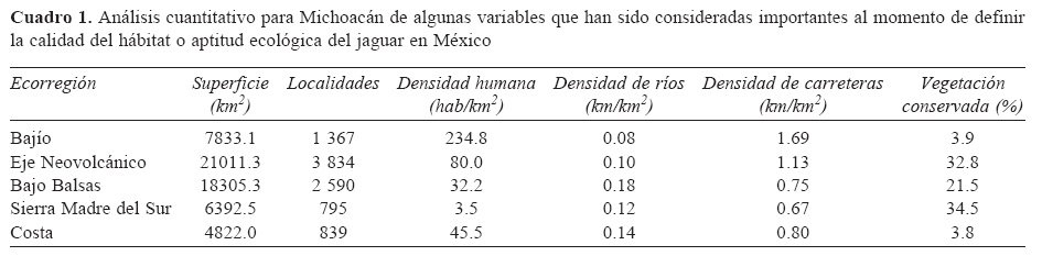 En general, y considerando las variables de densidad humana, densidad de ríos, de carreteras y cobertura de vegetación conservada, las regiones de la sierra Madre del Sur y del Bajo Balsas destacan por presentar en conjunto aptitud ecológica para el jaguar en el estado de Michoacán (Cuadro 1). La sierra Madre del Sur presenta la menor densidad humana, densidad de carreteras y el mayor porcentaje de vegetación conservada, y el Bajo Balsas presenta la densidad de ríos más alta y la segunda menor densidad humana, la menor densidad de carreteras, y la tercera región con el mayor porcentaje de vegetación conservada (Cuadro 1).