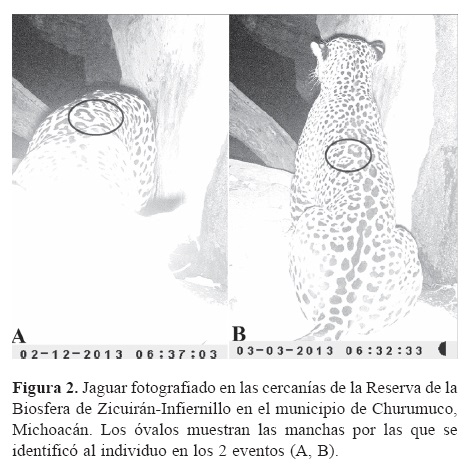 Se obtuvieron 7 fotografías de jaguar de la localidad de El Platanar, municipio de Churumuco (18°40'54.4" N, 101°25'41.8" O) (Fig. 1). Las fotografías corresponden a 2 fechas diferentes del mismo individuo, la primera fue tomada el 12 de febrero del 2013 a las 06:37 h y las otras 6 fotografías en 2 series consecutivas el 3 de marzo, entre las 06:29 y 06:32 h (Fig. 2). Las fotografías fueron depositadas en la Colección Nacional de Fotocolectas Biológicas de la UNAM, con el número de catálogo IBUNAM-CFB-17410 y IBUNAM-CFB-17411. La localidad se ubica a 130 km al noreste de los registros de jaguar del municipio de Arteaga (Charre-Medellín et al., 2013) y a 107 km al suroeste de los del Estado de México (Monroy-Vilchis et al. 2008) y colinda con la Reserva de la Biosfera de Zicuirán-Infiernillo (Fig. 1).