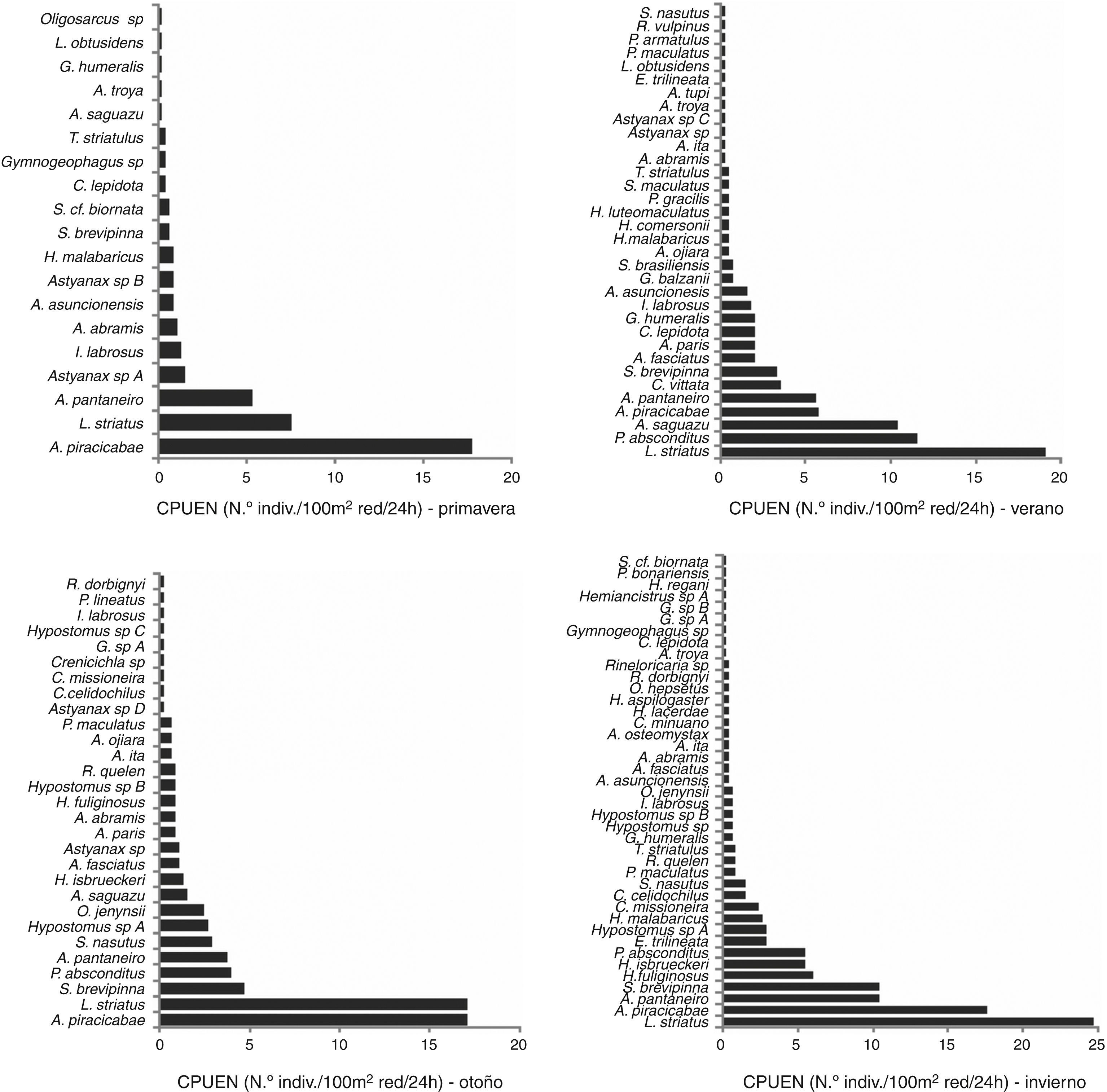 Del total de las especies, 15 fueron capturadas únicamente en la cuenca baja del arroyo Yabotí, algunas de pequeño porte como Astyanax tupi (A. tupi), Crenicichla minuano (C. minuano) y Platydoras armatulus, otras como Rhaphiodon vulpinus (R. vulpinus) y Auchenipterus osteomystax (A. osteomystax) de mediano porte y propias de ambientes de río. Los resultados del análisis canónico de componentes principales indican que no hay diferencia significativa (p> 0.05) en la composición y abundancia (captura por unidad de esfuerzo en número) entre los sitios de muestreo y entre las estaciones del año. La captura total fue de 73 (ind/100 m2/24 h), registrándose la mayor abundancia en la cuenca baja (128 ind/100 m2/24 h) durante el invierno (106 ind/100 m2/24 h). La composición específica analizada por estación del año mostró que el invierno fue más diverso con 41 especies; entre las que fueron más abundantes encontramos L. striatus, A. piracicabae, A. pantaneiro, S. brevipinna y Hemiancistrus fuliginosus, en tanto la primavera con 19 especies, fue la de menor diversidad. Veintiocho especies tuvieron registro en una sola estación, destacándose A. osteomystax, A. tupi, C. minuano, Crenicichla vittata, Hypostomus luteomaculatus (H. luteomaculatus), Hypostomus regani; y otras como L. striatus, A, piracicabae, A. pantaneiro, S. brevipinna, Iheringichthys labrosus y Astyanax abramis fueron capturadas en las 4 estaciones del año (fig. 2).