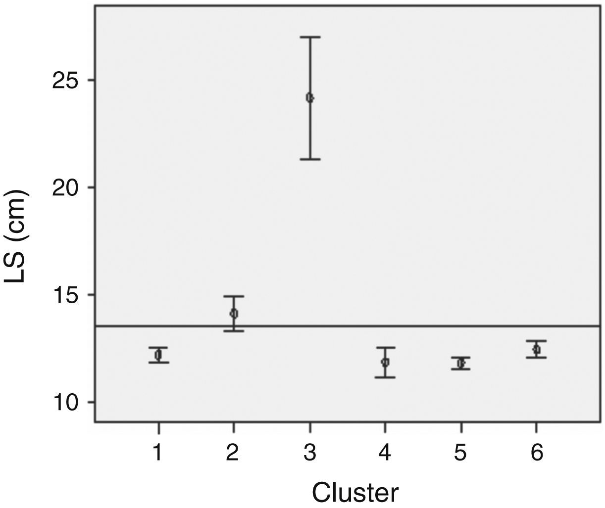 Tomando como variable la longitud estándar, el análisis cluster mostró que la comunidad íctica está integrada por organismos de una talla promedio de 13.52 cm, distribuidos en 6 conglomerados (fig. 4). El más numeroso tiene como variable de importancia el lugar de muestreo, siendo este la cuenca alta. Las especies que se destacan son: L. striatus, A, piracicabae, Astyanax saguazu, S. brevipinna y A. pantaneiro. El cluster 3 que presenta la mayor variación respecto a la variable longitud es el menos numeroso e incluye individuos de talla superior al promedio (24.1 cm). Los clusters 4, 5 y 6 aglomeran organismos capturados en la cuenca baja y en ellos adquiere relevancia la variable estadio reproductivo en coincidencia con los mayores valores hallados en la RGS promedio. Las especies más abundantes fueron: A. piracicabae, L. striatus, P. absconditus, S. brevipinna y A. pantaneiro.
