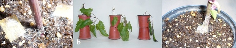 Figure 3 Results of target inoculations of Pseudogynoxis benthamii with Sclerotium rolfsii. a, Hyphal strands emerging from the inoculum plugs, and developing towards the substrate and the lower stem; b, from left to right: Control plant, and wilting infected plants 7 days from inoculation; c, hyphal growth around the stem base.