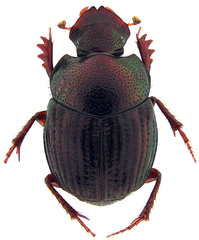 Holotipo hembra (Fig. 1). Longitud 5.1 mm, anchura elitral 3.3 mm, anchura pronotal 2.9 mm. Superficie dorsal negra brillante, con reflejos rojos y verdes. Cabeza: superficie glabra. Clípeo fuertemente bisinuado, con puntos transversales impresos superficialmente. Carina clipeal elevada, volviéndose inaparente hacia las genas. Superficie de la frente plana, con puntos ocelados profundamente impresos. Carina frontal ausente. Suturas genoclipeales débilmente impresas. Puntuación de las genas similar a la puntuación de la frente. Pronoto: superficie glabra, sin proyecciones o tubérculos. Puntuación pronotal profundamente impresa, irregular en tamaño y ocelada. Fóveas laterales inconspicuas. Microescultura lisa. Élitros: estrías elitrales profundamente impresas, con puntos profundos y ocelados espaciados regularmente. Interestrías con puntuación débilmente impresa y simple (no ocelada). El ápice de las interestrías con sedas inconspicuas, escasas y dispersas; excepto en la interestría más extensa, que posee sedas en toda su superficie. Microescultura lisa. Pigidio: puntuación profundamente impresa, ocelada y espaciada regularmente. Sedas inconspicuas, escasas y dispersas. Microescultura lisa. Patas: protibia cuadridentada en el borde externo, de apariencia ancha, con proyecciones ausentes en el borde interno y el ápice. Meso y metafémures bicolores. Vagina (Fig. 4): porción ventral esclerosada, con forma de una banda delgada, que se curva hacia arriba en los extremos laterales.