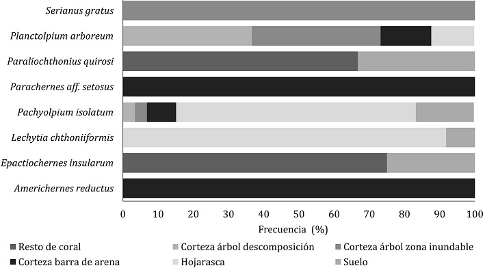 De acuerdo con los resultados obtenidos por la medida de selectividad de Manly (1974), aunque las especies tienen cierta preferencia por un microhábitat (Fig. 8A), también hacen uso de otros microhábitats (Fig. 8D). Las especies P. quirosi y E. insularum tienen un comportamiento similar, aunque éstas prefieren áreas de restos de coral, hacen uso de la hojarasca respectivamente (Fig. 8D); las especies A. reductus, P. aff. setosus y S. gratus pueden considerarse aquí como corticícolas y exclusivos de este microhábitat debido a que prefieren y usan este microhábitat respectivamente (Fig. 8D); P. arboreum, aunque prefiere la corteza de los troncos en descomposición, utiliza la corteza de los árboles en la barra de arena (Fig. 8D); en contraste, L. chthoniiformis prefiere el suelo y utiliza la hojarasca, sin embargo, P. isolatum presentó preferencia por el suelo (Fig. 8D), pero utiliza una amplia variedad de microhábitats como hojarasca, corteza de árbol en descomposición y corteza de árbol en la barra de arena en los fragmentos de bosque de manglar evaluados (Fig. 8D).