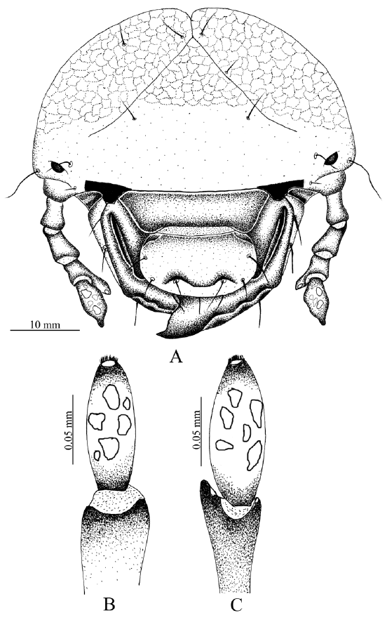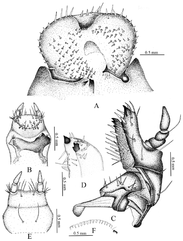 Cabeza (fig. 1A). Amplitud de la cápsula cefálica 4.44-4.23 mm. La cabeza de color negro, con la superficie del cráneo finamente punteada. Frente con 2 sedas dorsoepicraneales; 6 sedas epicraneales diminutas; 1 seda frontal posterior a cada lado; sedas frontales exteriores y anteriores ausentes; 1 seda en el ángulo frontal anterior en cada lado; 1 seda al lado de cada estemma; superficie con 10 sedas dispersas cortas, espiniformes. Estemata pigmentado y claramente desarrollado. Clípeo (fig. 1A). Con 1 seda lateral a cada lado y sin sedas centrales; postclípeo sin sedas. Labro (fig. 1A). Subtrapezoidal, con 2 sedas posteriores, 2 sedas centrales, 4 sedas laterales a cada lado, 2 sedas apicales delgadas y largas. Epifaringe (fig. 2A). Ligeramente asimétrica (1.61 mm de ancho por 1.12 mm de largo). Epizigum corto y amplio, de color pardo obscuro, haptomerum con 3-4 heli apicales amplios; plegmatia, proplegmatia y clithra ausentes; corypha con 6-8 sedas delgadas y largas. Acroparia con 16-18 sedas delgadas y largas; acanthoparia con 9-12 sedas cortas, espiniformes y recurvadas. Chaetoparia izquierda con 42 sedas cortas y gruesas, 43 sedas largas y delgadas; Chaetoparia derecha con 28 sedas cortas y gruesas, 35 sedas largas y delgadas. Dexiotoma larga y moderadamente amplia; pterotoma desarrollada y redondeada; laeotorma delgadas y dilatada apicalmente hacía el pedium; dexiotorma más larga de la laeotorma. Laephoba ausente. Haptolechus y margen interno de la laeotorma formado por 15 sedas delgadas y largas; haptolechus con 4 macrosensilas. Dexiophoba ausente; placa esclerosada corta con 4 sensilias; placa esclerosada delgas y apicalmente aguda. Crepis estrecho, ligeramente esclerozado y discontinuo mesalmente. Mandíbula izquierda (fig. 3A-C). Área incisiva con 3 dientes (S1, S2 y S3), el tercer diente (S3) separado por escotadura incisiva; área molar con 2 lóbulos amplios, convexo (M1-2), lóbulo distal (M1) desarrollado; escrobe con 5 sedas delgadas y largas; 4 sedas cortas y delgadas basolaterales; brustia formada por 20 sedas delgadas y moderadamente largas; acia elongada con 12 sedas en la base y el ápice; proceso ventral desarrollado con muchos asperitos. Área ventral con 38 líneas estridulatorias mandibular y 8 sedas dorsomolares. Área dorsal con 10 setas dorsomolares. Mandíbula derecha (fig. 3B-D). Área incisiva con 3 dientes (S1, S2 y S3), el tercer diente (S3), está separado por una escotadura incisiva; área molar con 2 lóbulos amplios, convexo (M1-3), lóbulo distal (M1) desarrollado; escrobe con 6 sedas delgadas y largas; 8 sedas cortas y delgadas basolaterales; calx desarrollado, truncado apicalmente; brustia formada por 14 sedas delgadas y largas; proceso ventral desarrollado, con asperitos. Área ventral con 35-36 líneas estridulatorias mandibulares y 9 sedas dorsomolares. Área dorsal con 1 seda dorsomolar. Maxilas (fig. 2C). Con 1 uncus en la galea; lacinia con 3 unci unidos en la base, rodeados por 9 heli. Área estridulatoria maxilar (fig 2F) formada por 15 dientes amplios, truncados y en direc postero-anterior, los 2 últimos dientes separados d precedentes; proceso anterior presente. Labio (fig. 2-E). Escleroma hipofaríngeo asimétrico, con el lado derecho prominente y el izquierdo reducido; lóbulo lateral derecho con 21 sedas largas y delgadas; lóbulo lateral izquierdo 11 sedas delgadas y largas, 8 sedas cortas y delgadas. Glosa con 34 sedas delgadas y largas laterales y 40 sedas cortas y delgadas; 20 sedas cortas, espiniformes sobre una placa esclerosada en el centro. Antena (fig. 1B, C). Segundo antenómero 2 veces el largo del primero, tercer antenómero con proceso ventral apical soportando un punto sensorial. Último antenómero con 6-7 puntos sensoriales dorsales y 5-6 puntos sensoriales ventrales.