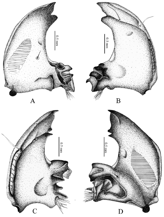 Figura 3 Platycoelia puncticollis. A, Mandíbula derecha (vista dorsal); B, mandíbula derecha (vista ventral); C, mandíbula izquierda (vista ventral); D, mandíbula izquierda (vista dorsal).
